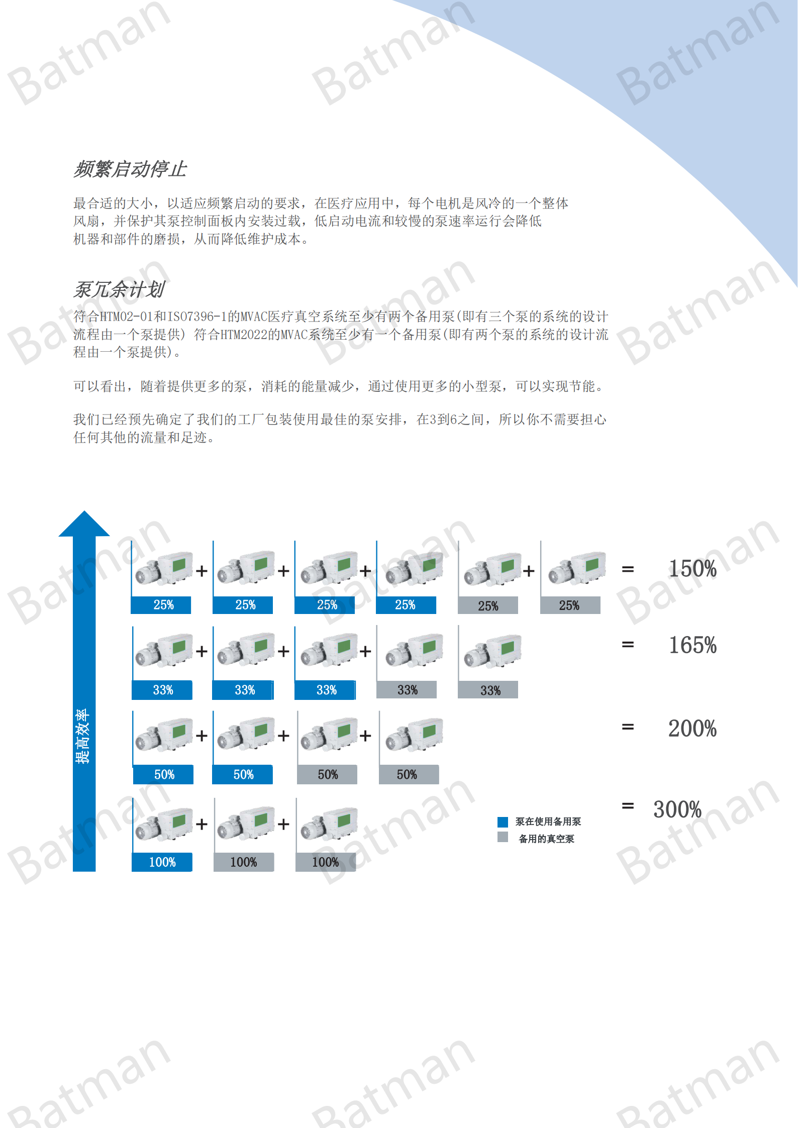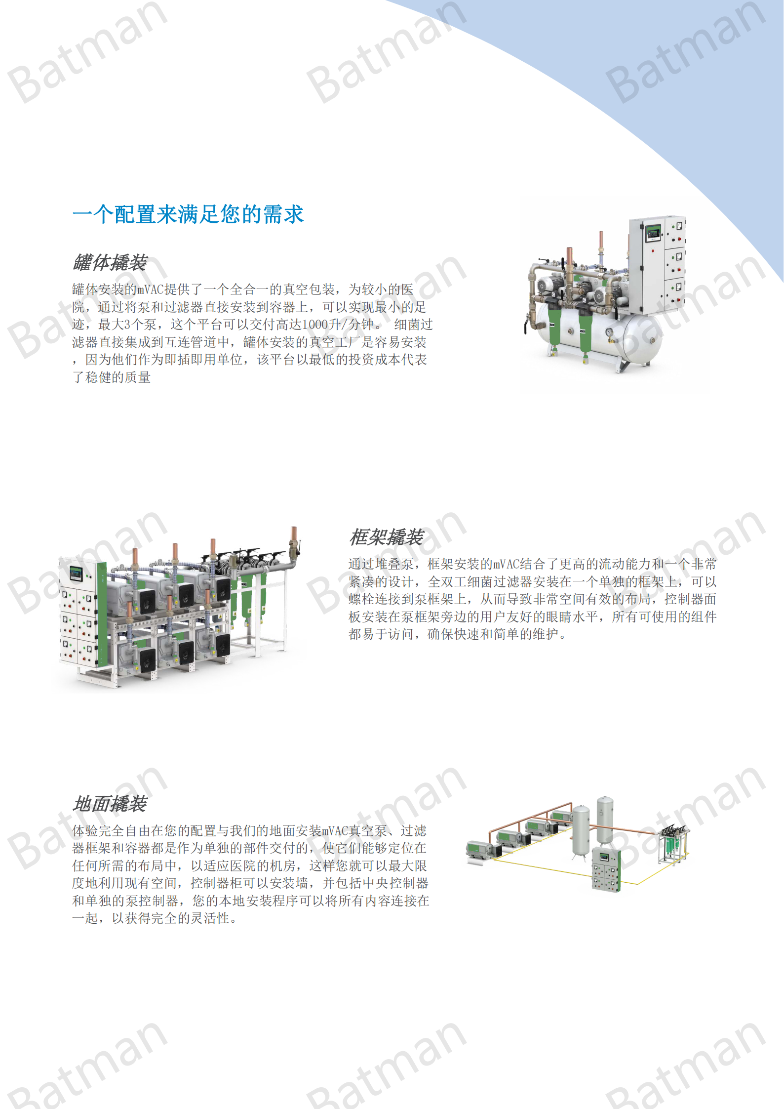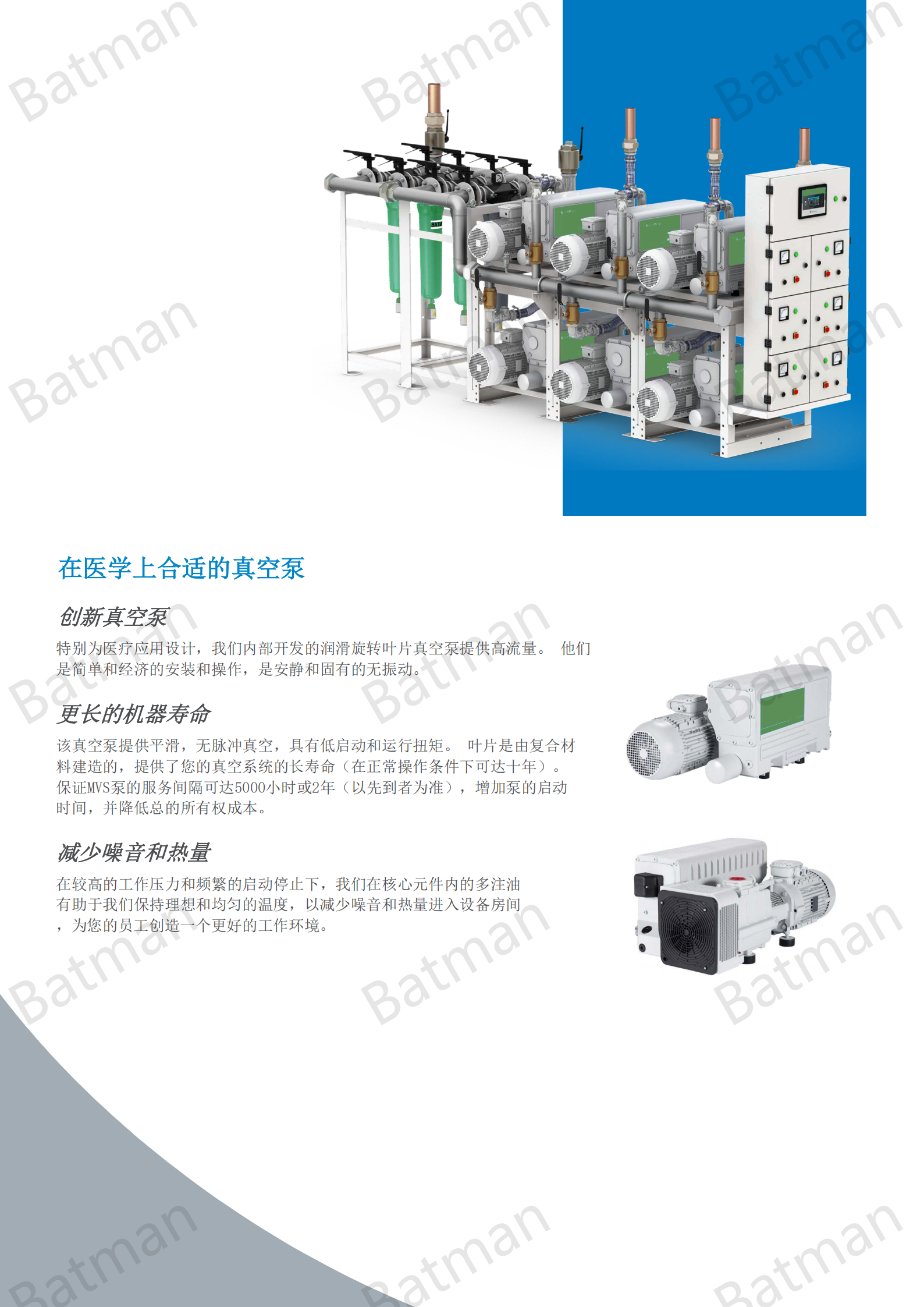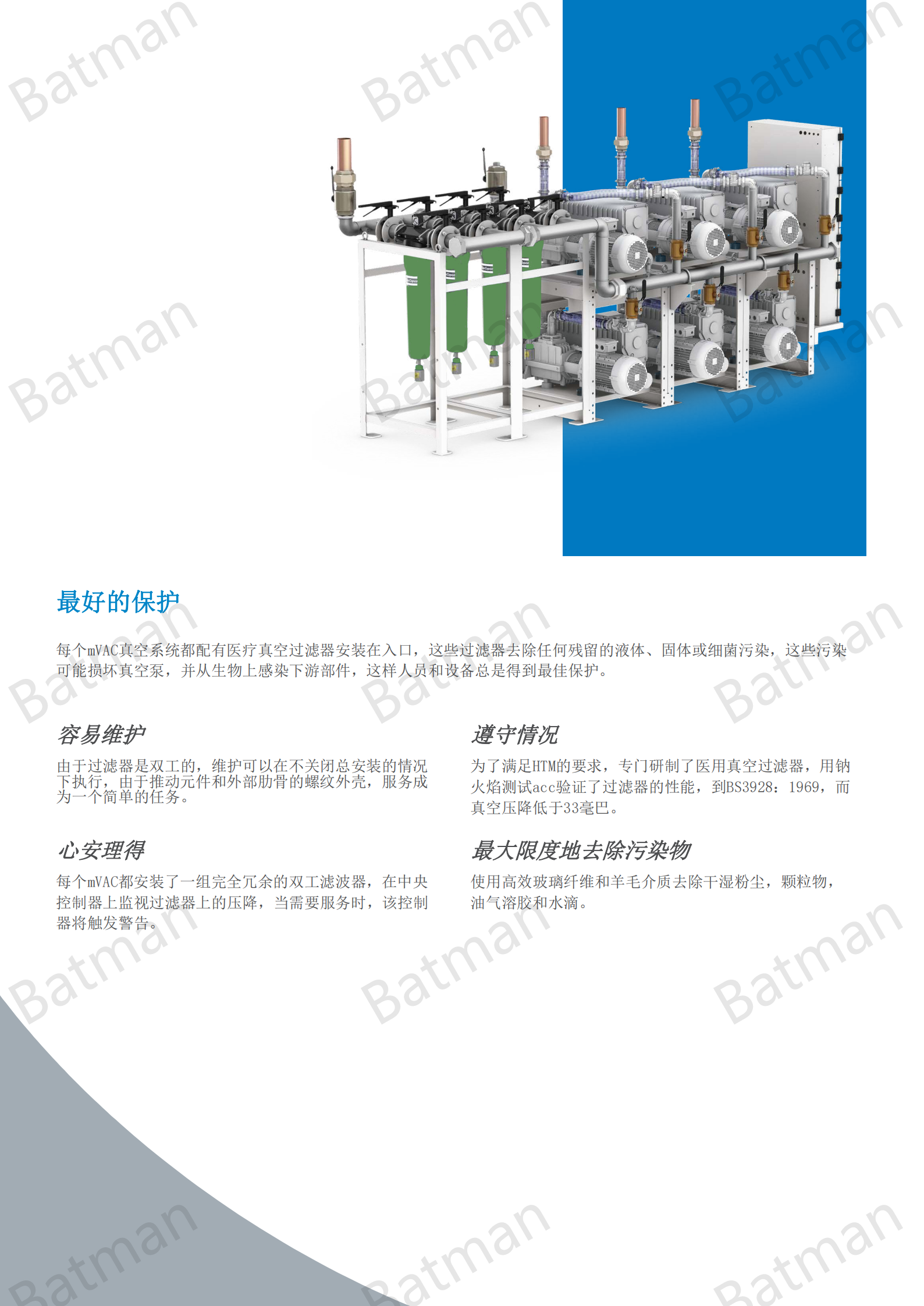 Batman mVAC医用中心吸引系统由中心吸引站的真空泵机组作为负压源,通过真空泵的抽 吸使吸引系统管路达到所须的负压值,在手术室、抢救室、治疗室和各个病房的 终端处产生吸力,主要用于吸除病人体内的痰、血、脓及其他污染物。